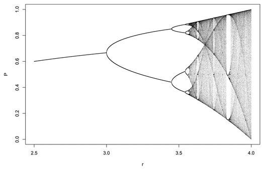后来我渐渐得知,「禅修的循环反馈原理」这个词的源头来自坦尼沙罗尊者(Thanssaro Bhikku),也称阿姜杰夫(Ajaan Geoff),是森林传承圣地亚哥慈林寺住持。同时,我在上Mathlab编程课的时候,第一次亲手采用短短几行代码就画出了著名的分形图形 Logistic Map(见下图)。大受震撼!而且复杂的海岸线的问题以及边长是无限,但是面积却有限的「科赫雪花曲线」也让我直觉上觉得这和禅修中注意力越来越细腻时产生的狂喜的经验是相关的。因为分形图形的产生和「自循环反馈函数」的无穷迭代运算直接相关。大概是2013年左右,我在访问慈林寺的时候向坦尊提出了我认为佛法禅修的原理直觉上是可以用混沌理论(Chaos Theory)来解释的设想。坦尊起身回到佛堂,拿出两本书递给我,他翻开薄一点的那本,指着其中一篇文章《Samsara devided by Zero》(《轮回除以零》)说:“This is the short version.”(这是短的解释版本)。又递给我这本《The Shape of Suffering》(《苦的形状》)说:“This is the long one.”(这是长篇的解释)。回来读了之后,心里就有了一个愿望,有一天,我能够把它们翻译成中文就好了。11年过去了,于是有了今天这本书的初稿。